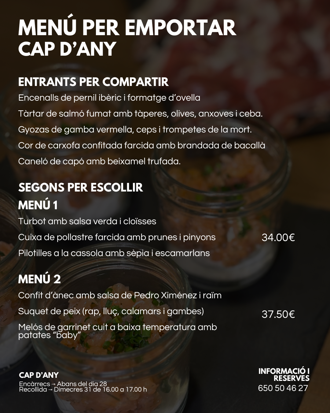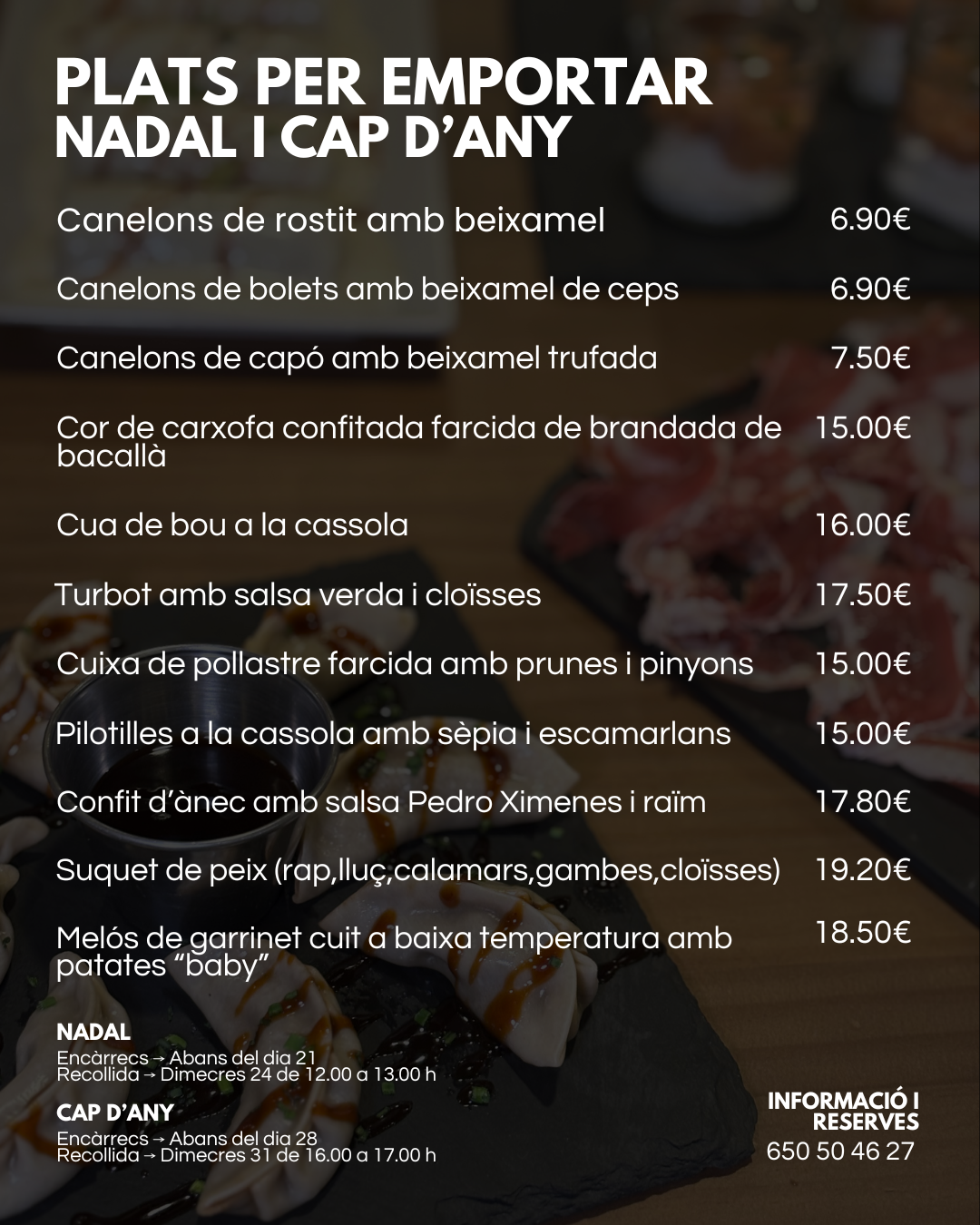 Aquestes festes, gaudiu de la millor cuina sense complicacions. Descobriu els nostres menús i plats especials de Nadal i Cap d'Any i encarregueu-los amb antelació. Gràcies per la confiança!